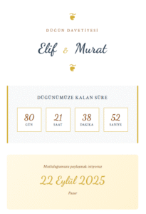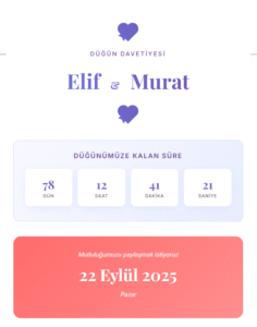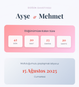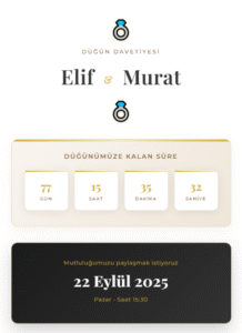Dijital davetiyelerimiz, sadece şık bir tasarımdan ibaret değil; aynı zamanda işlevsel detaylarla zenginleştirilmiş modern bir deneyim sunar. Etkinlik gününüze özel geri sayım özelliği, heyecanı paylaşmanıza yardımcı olurken; fotoğraf galerisi sayesinde en güzel karelerinizi sevdiklerinizle buluşturabilirsiniz.
